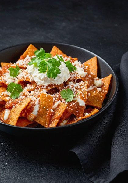 Huevos estrellados con su yema suave, cubiertos de salsa roja y montados sobre tortillas fritas doradas.