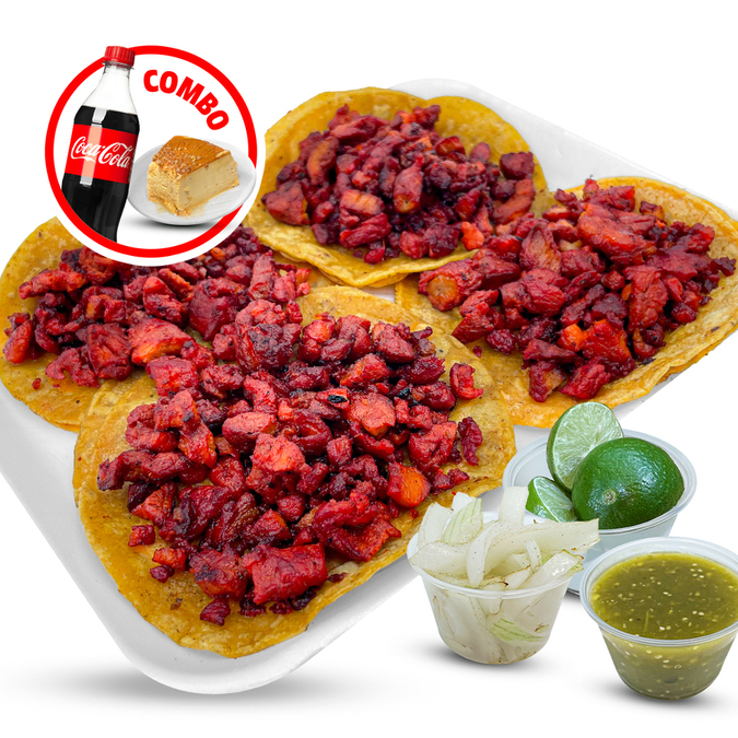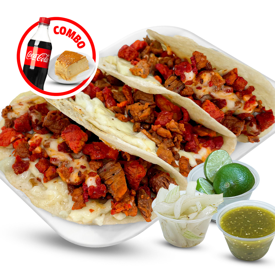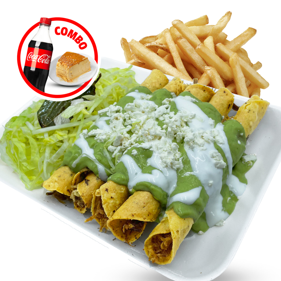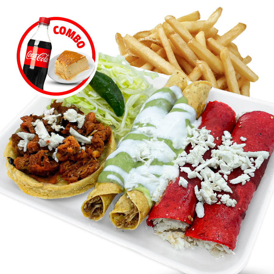 2 Flautas,2 Enchiladas,1 Sope a elección, papas a la francesa, coca cola y postre.