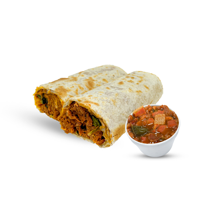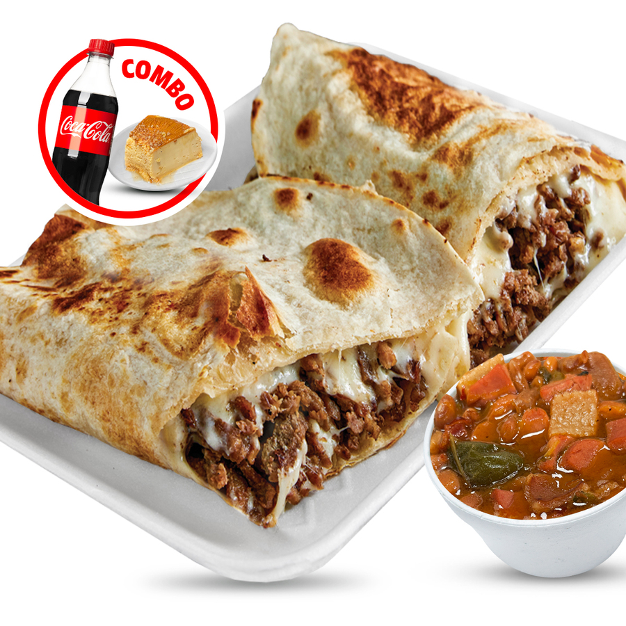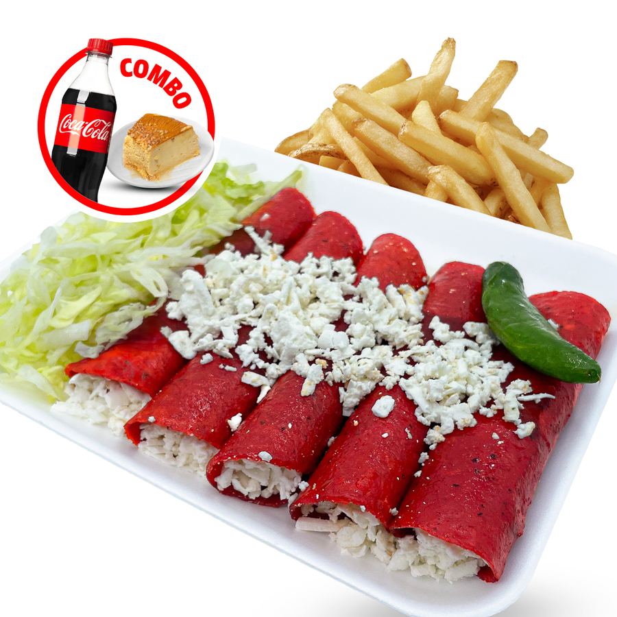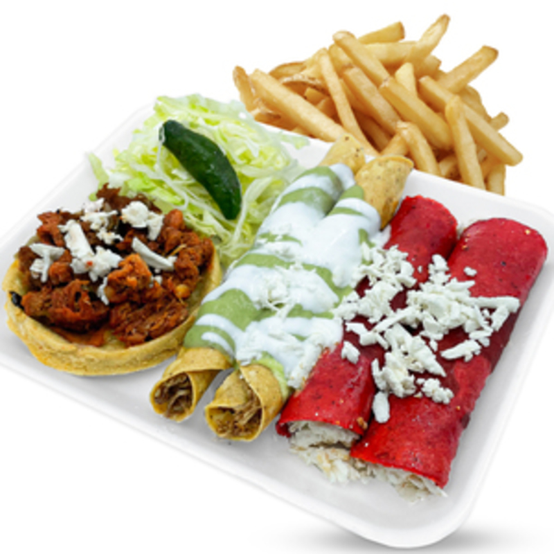 2 Flautas,2 Enchiladas y 1 Sope a elección, acompañados de papas a la francesa.