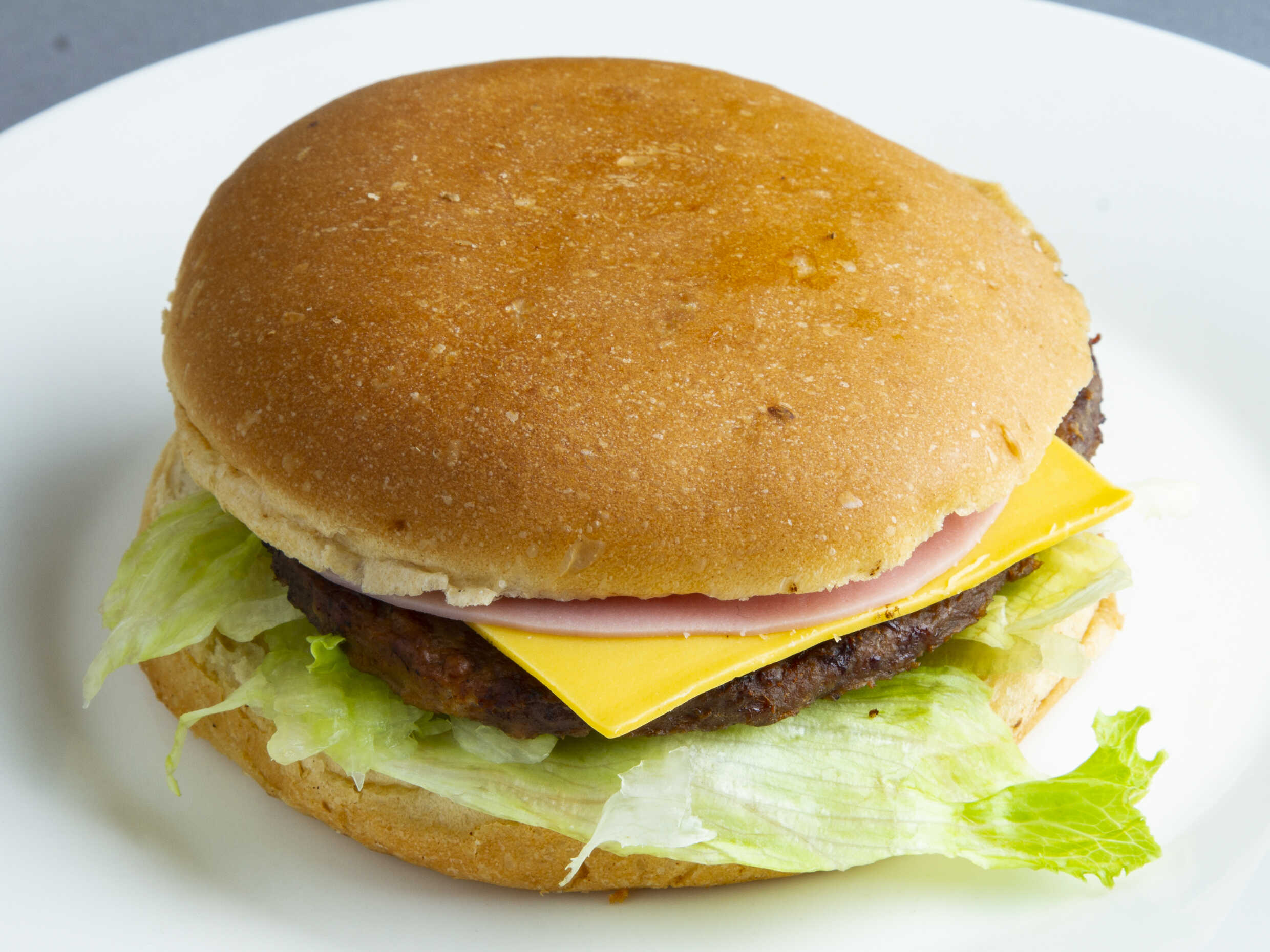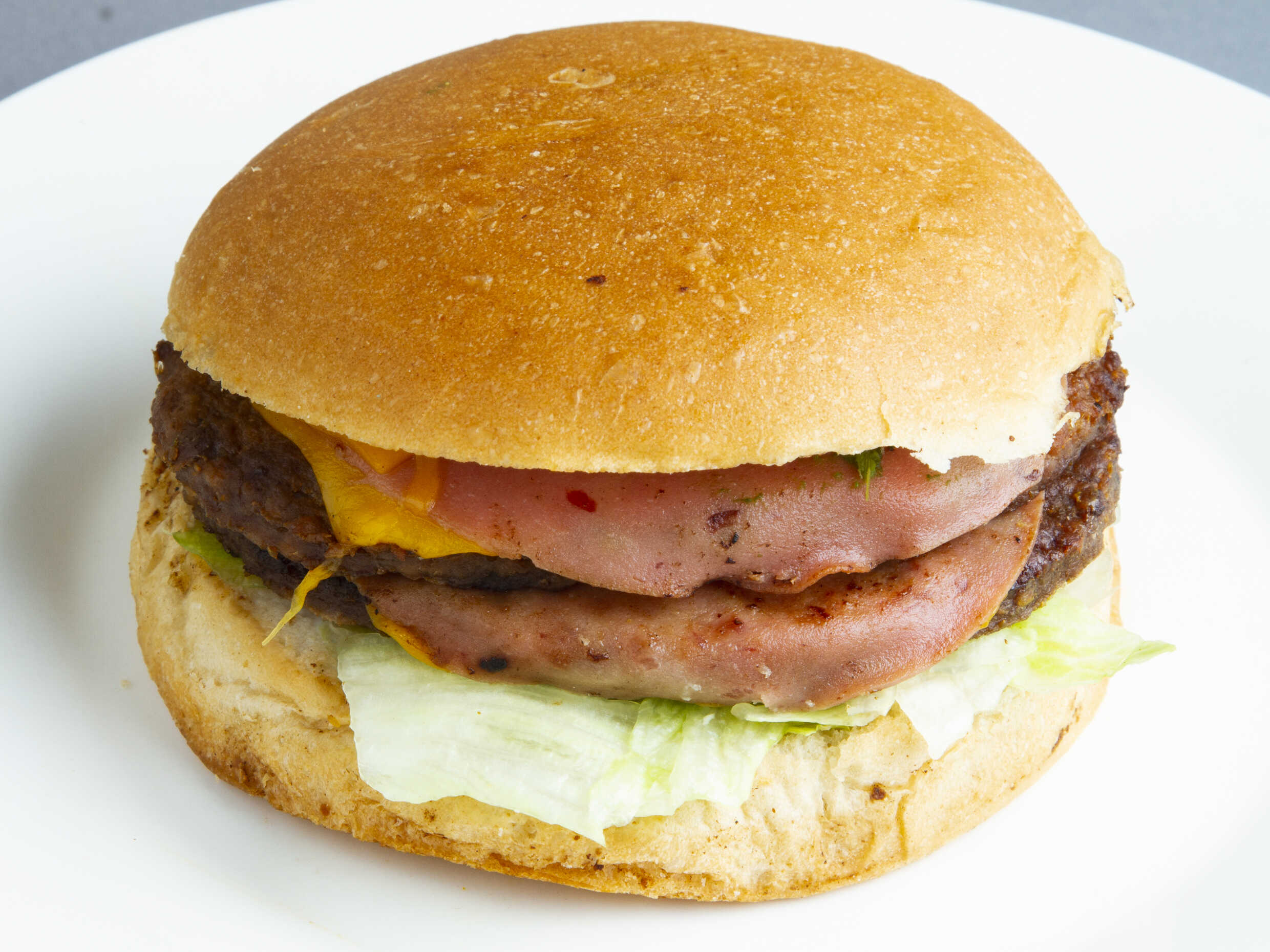 Pan artesanal del día, doble carne de res, queso americano, jamón, lechuga, tomate, cebolla, mayonesa, catsup, mostaza y aguacate.