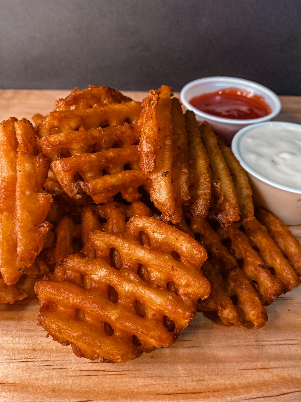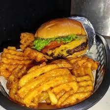 Hamburguesa con carne de res, papas crisscut, lechuga, tomate, cebolla, ranch y búfalo.