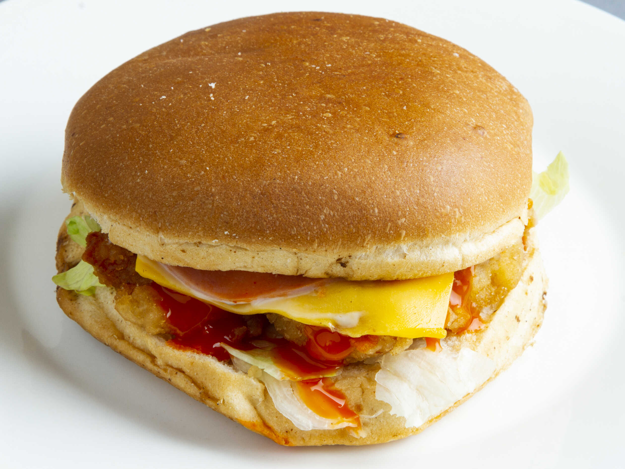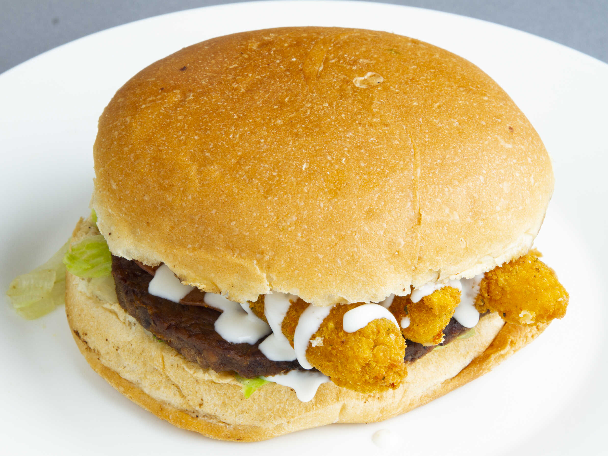 Pan artesanal del día, boneless bañados en búfalo, queso americano, jamón, lechuga, tomate, cebolla, mayonesa, catsup, mostaza, ranch y zanahoria rallada.