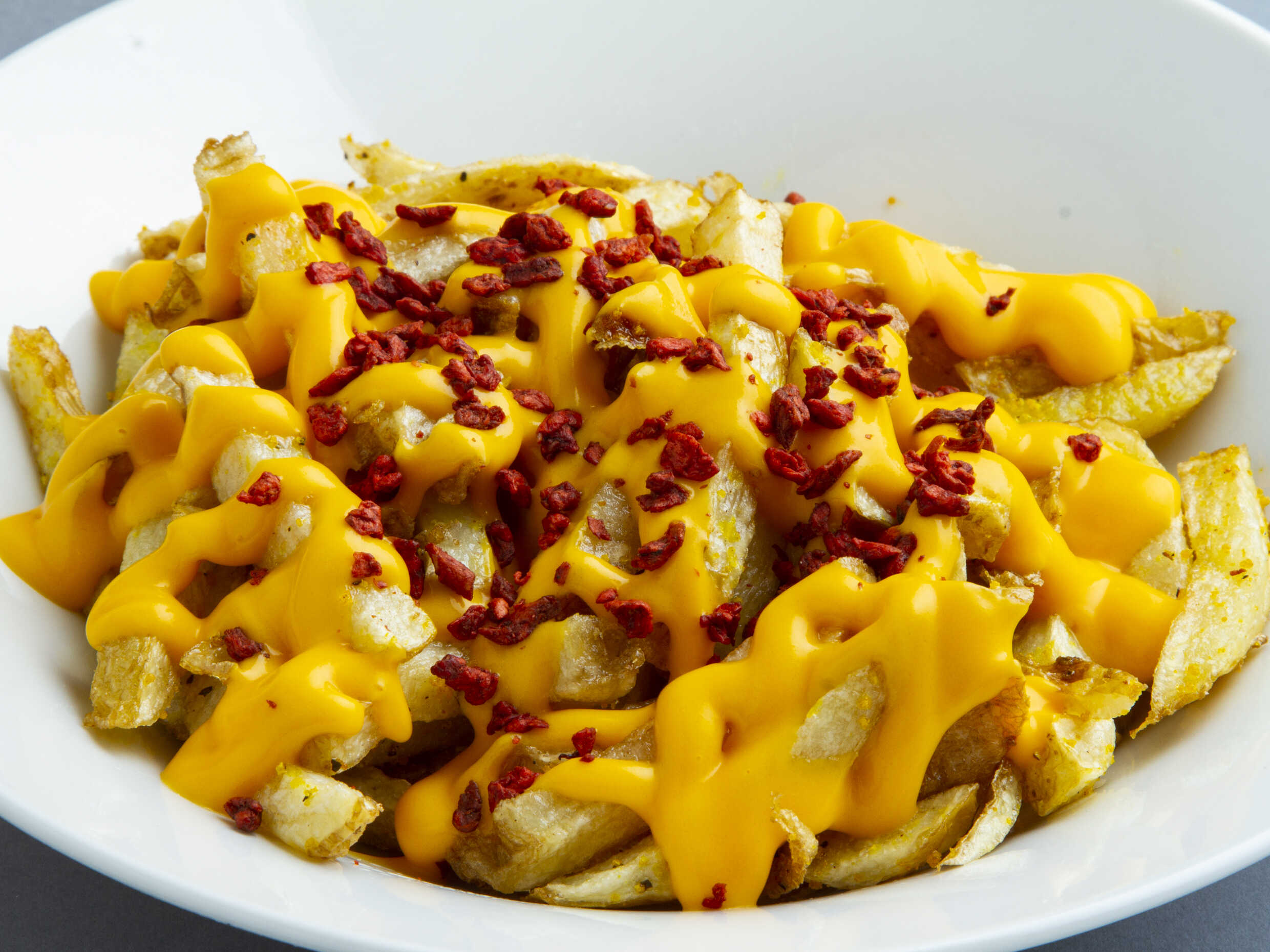 200 g De deliciosas papas a la francesa sazonadas, bañadas de queso cheddar y tocino.