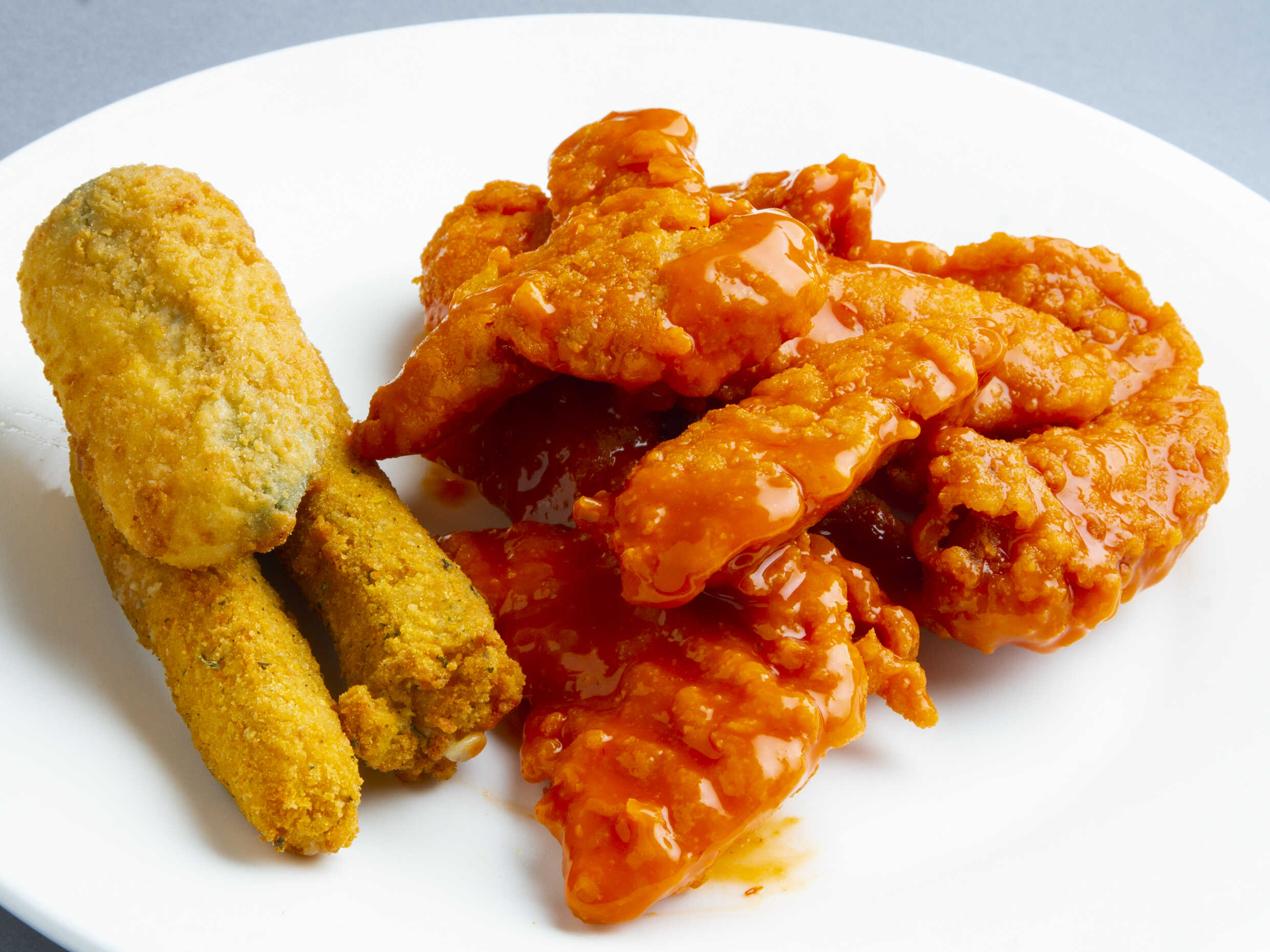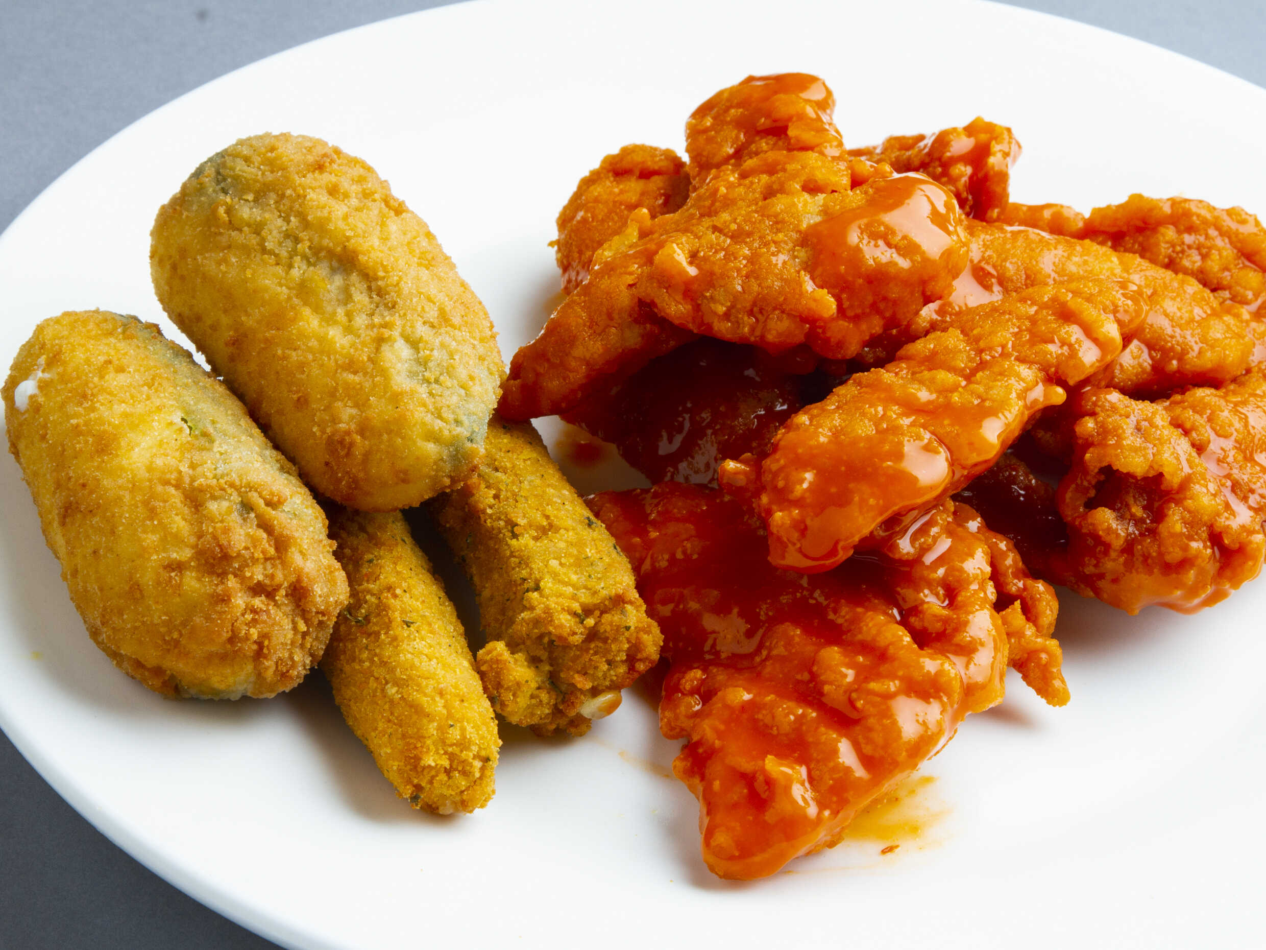 10 Boneless bañados en salsa de tu elección, 2 dedos de queso y 2 popper's.