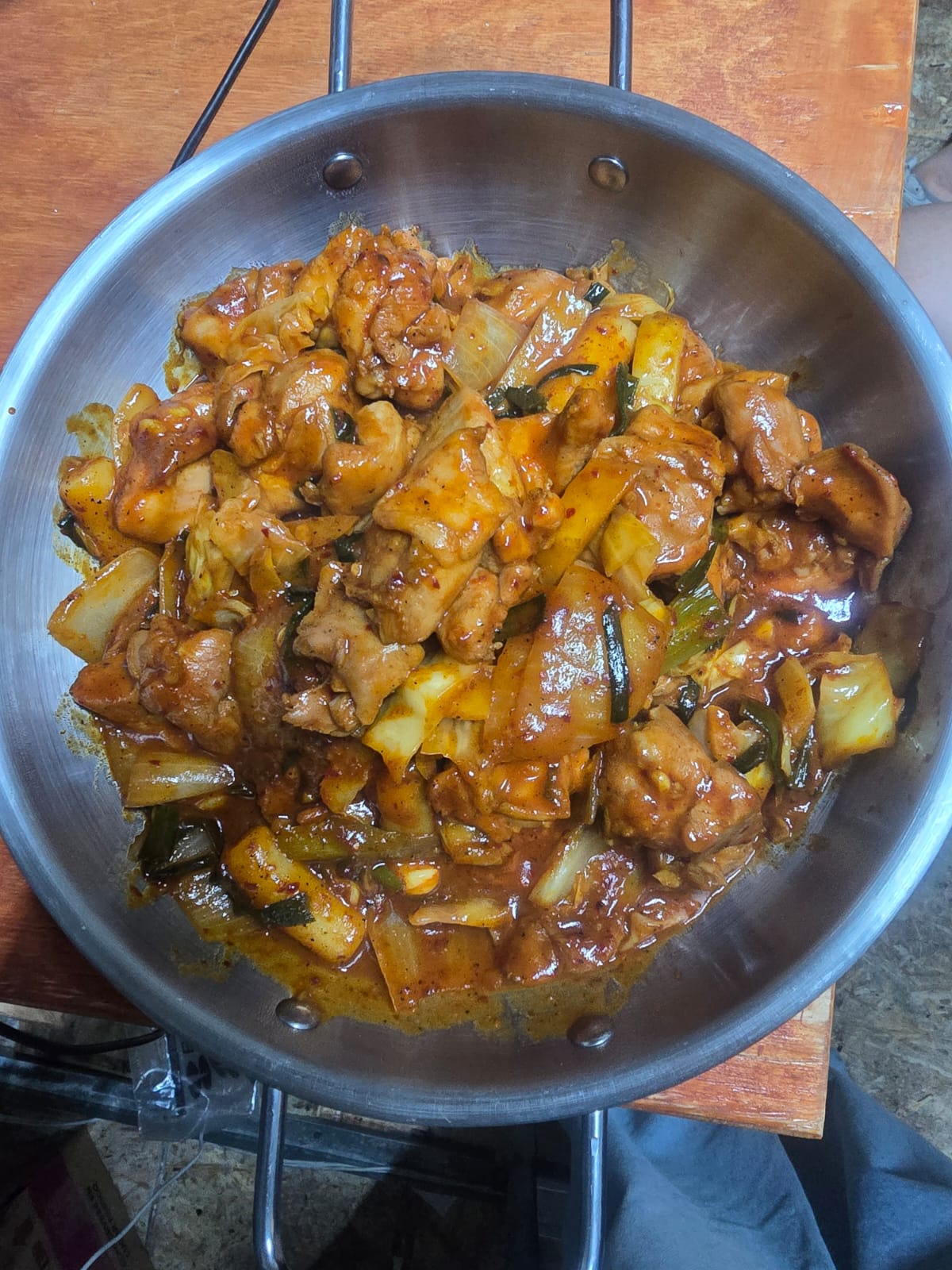 Pollo Frito con salsa clasica Coreana acompañado con papas gajo