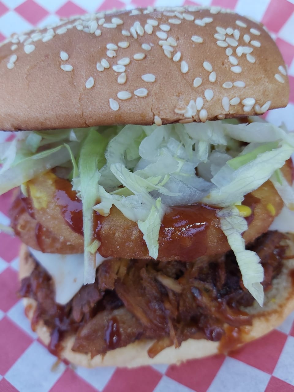 Pierna de puerco, bañada en salsa bb, aros de cebolla, queso manchego, lechuga y un toque de mostaza, acompañada de 200grs. de papas