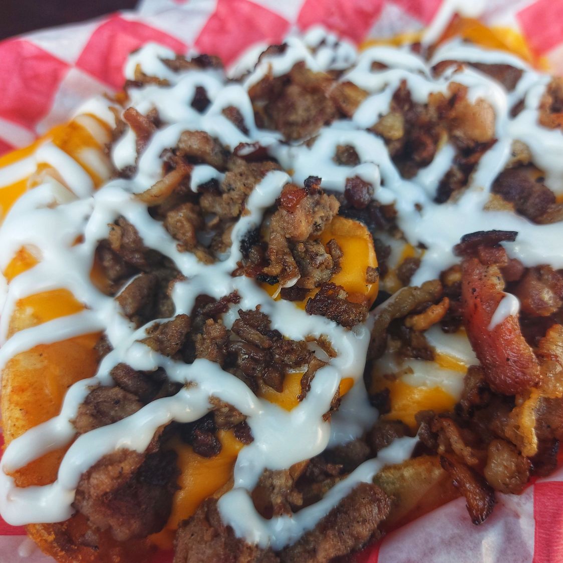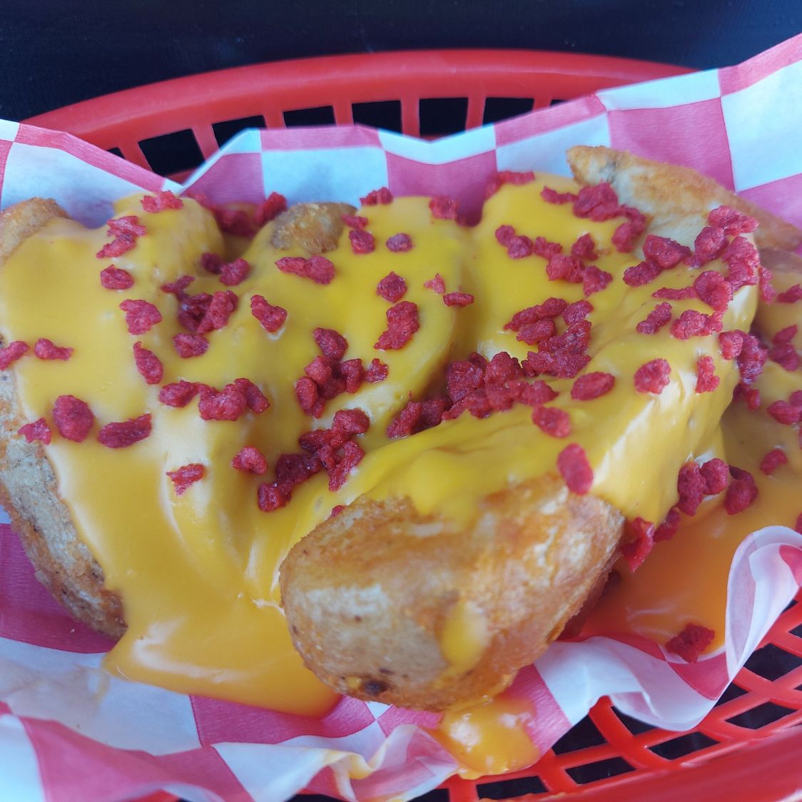 250grs de papas bañadas queso cheddar con tocino deshidratado