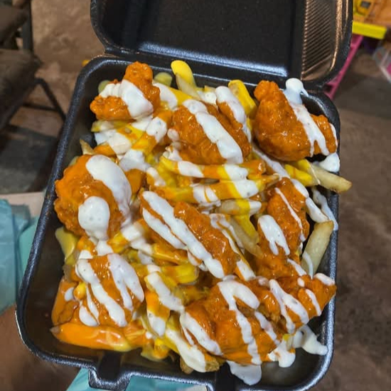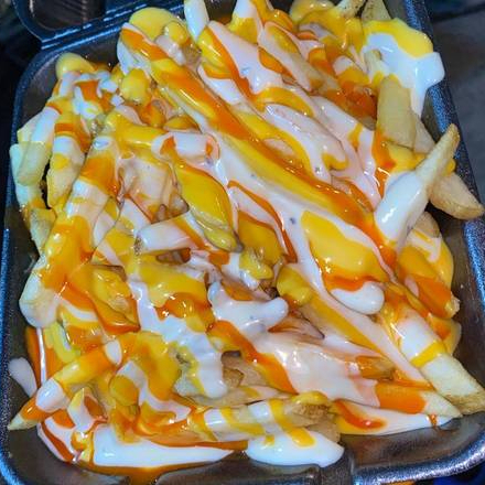 500 g De papas sazonadas y cubiertas de salsa búfalo, aderezo ranch, queso cheddar.