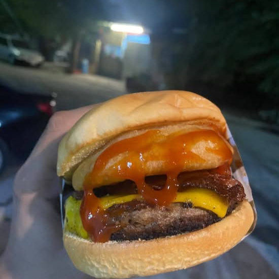 Pan brioche, carne sirloin, BBQ, aros de cebolla recién hechos, queso amarillo.