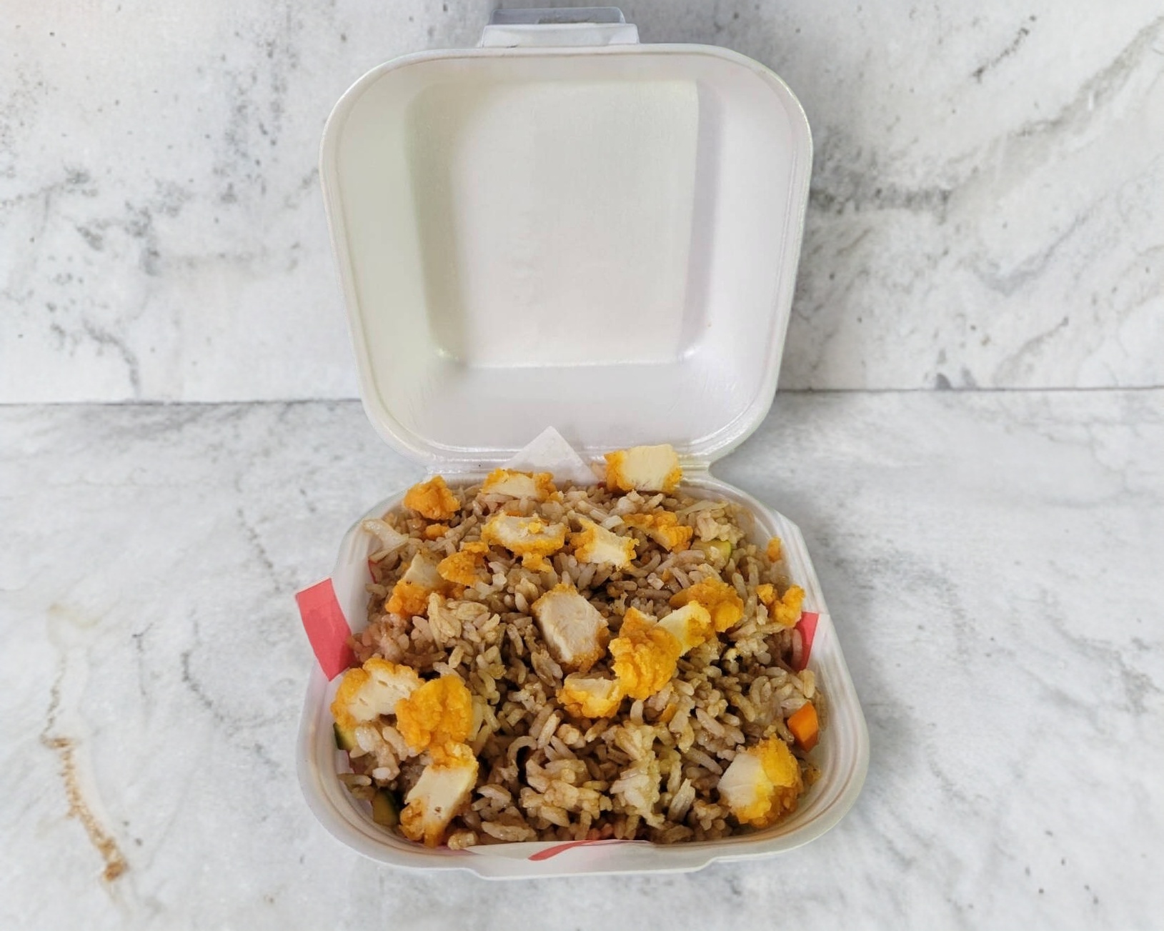 Arroz frito con verduras: zanahoria, calabacita y cebolla, y trocitos de pollo empanizados.