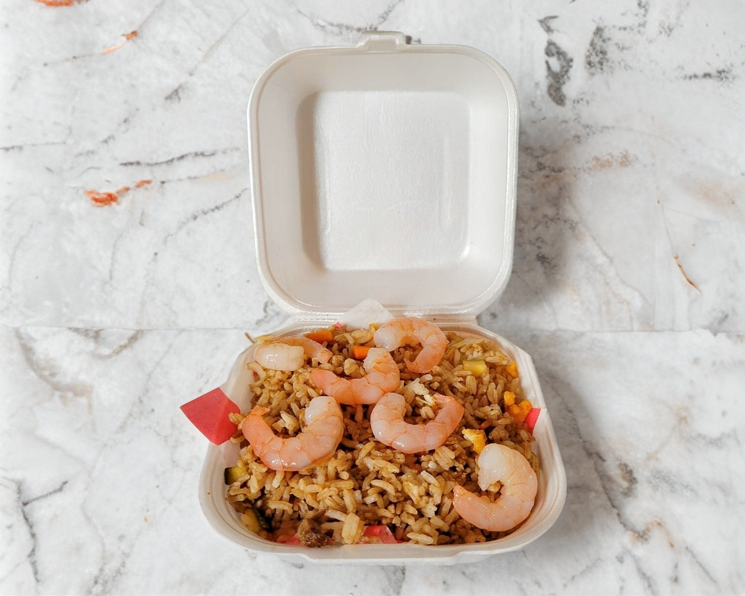 Arroz frito con verduras: zanahoria, calabacita y cebolla, y trocitos de camaron.