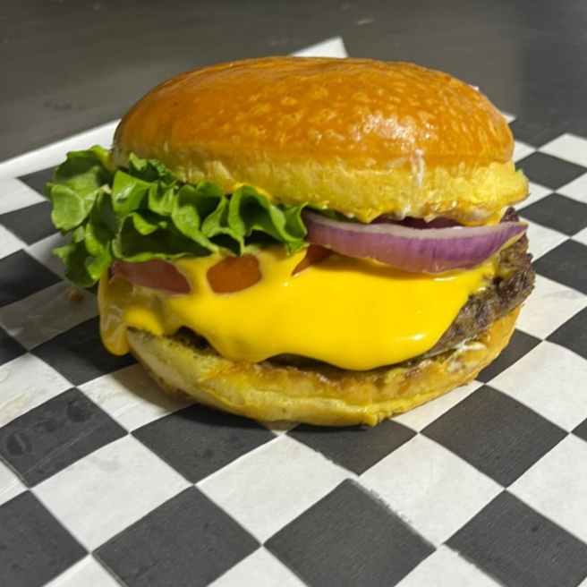 Pan brioche, carne de sirloin, queso americano, lechuga, tomate, cebolla.