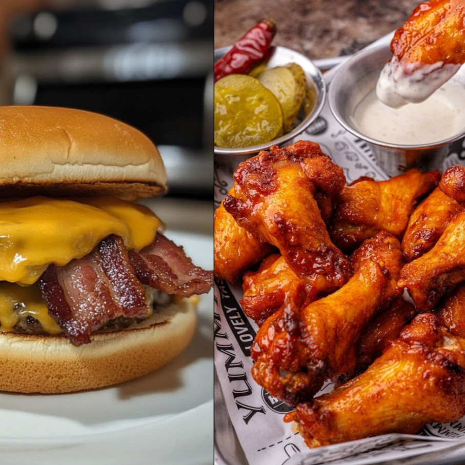 CLASIC BACON CHEESE + ORDEN DE ALITAS BAÑADAS AL GUSTO
