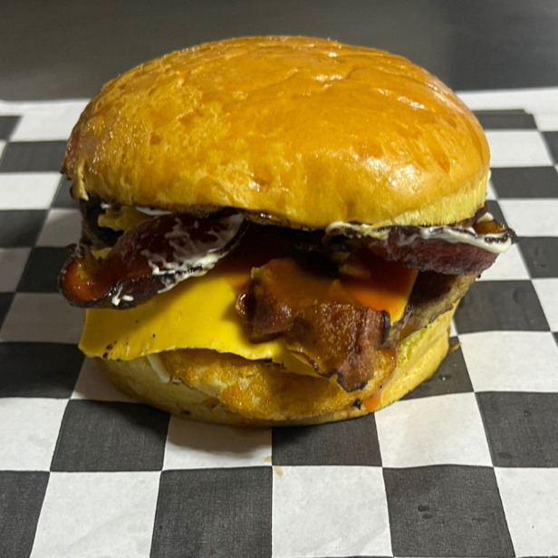 Pan brioche, carne de res, queso americano, aros de cebolla, tocino y salsa BBQ.