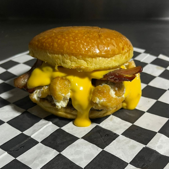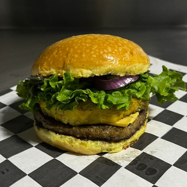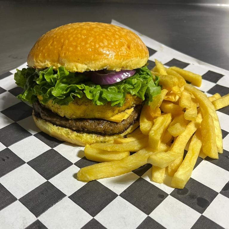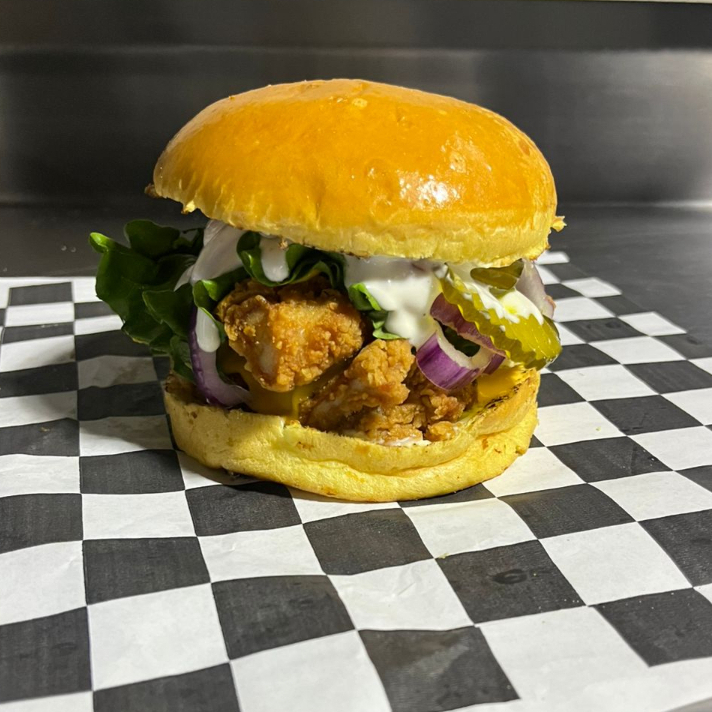 Pan brioche, 2 pzas de chicken, 2 quesos americanos, aderezo especial y lechuga.