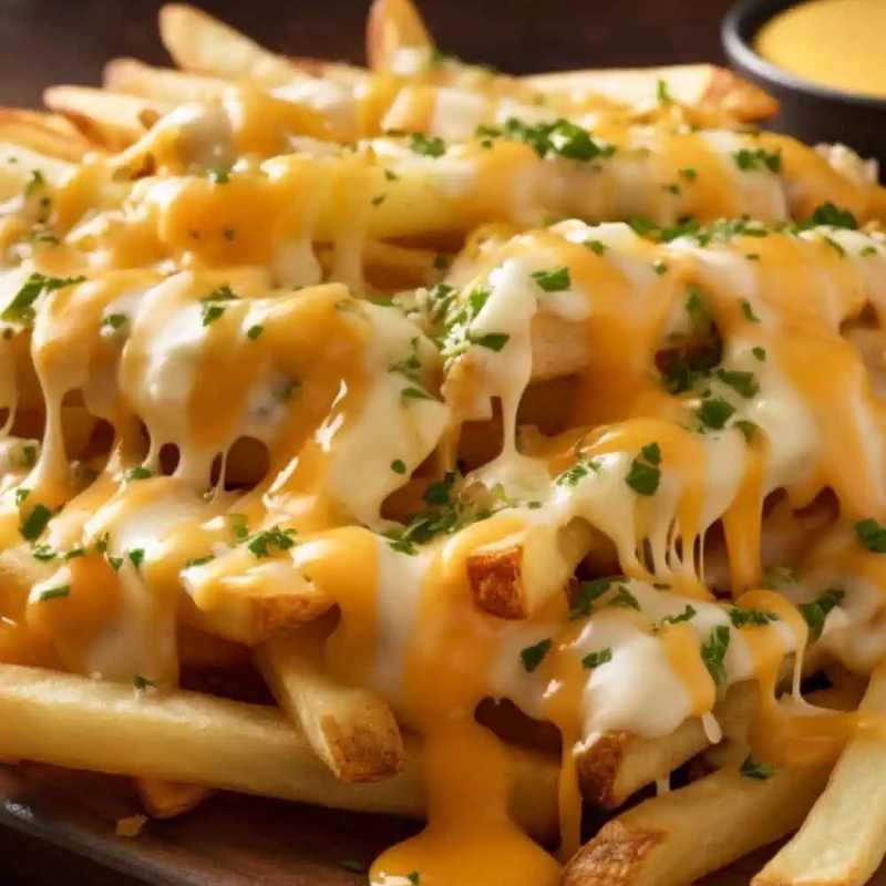 Papas fritas 350 g, con salchichas, queso y tocino.