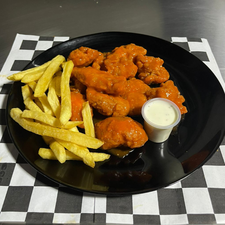 500 g De boneles, bañado con tu salsa a elegir, porción de papas y ranch.