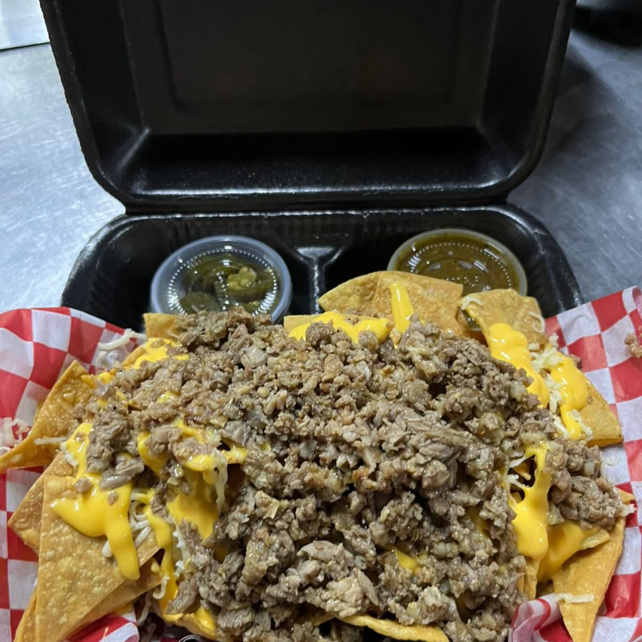 Una orden de papas fritas bistec trompo queso amarillo queso asadero bolsa de