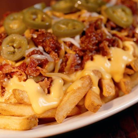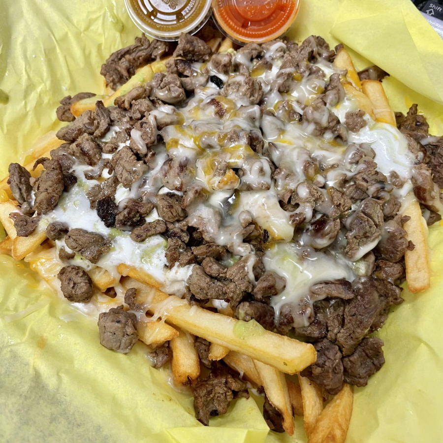 Una orden de papas fritas bistec queso asadero gratinado queso amarillo