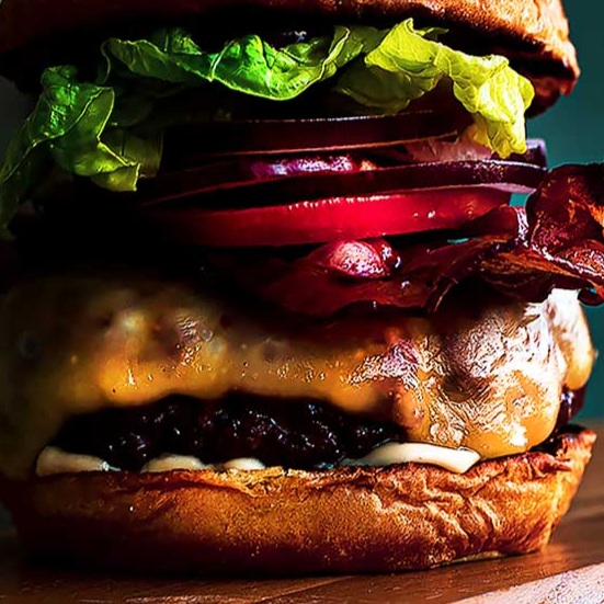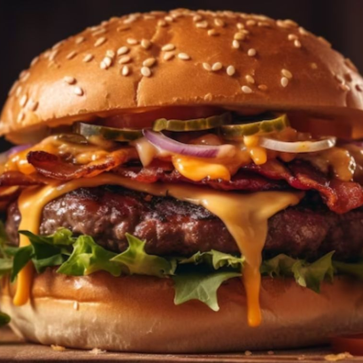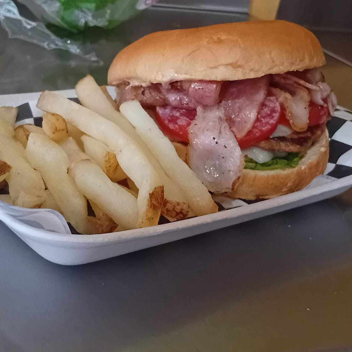 90 g de carne casera lechuga tomate aderezo mamalón de tocino y guacamole una porción de papas fritas