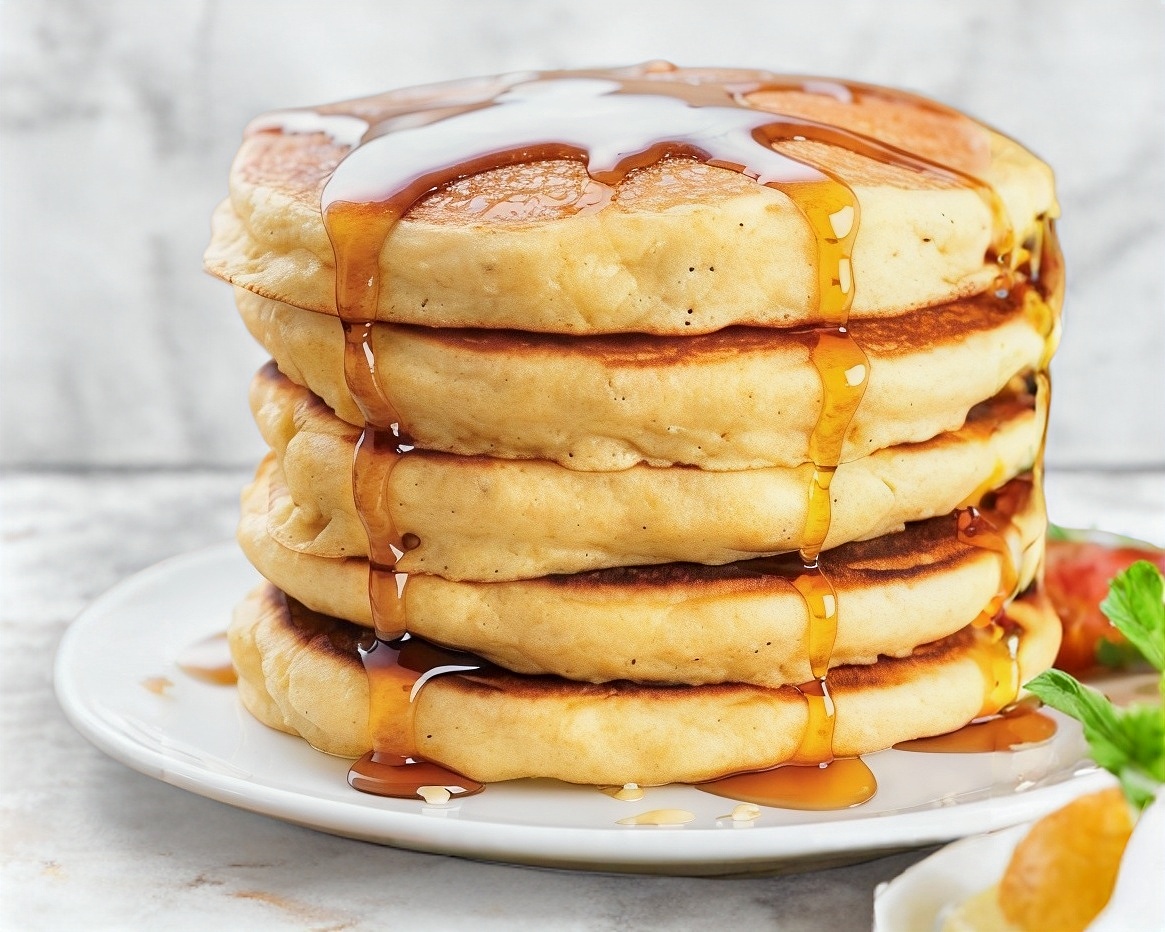 3 piezas de ricos y esponjosos hot cakes, bañados en mantequilla y acompañados con dos porciones de miel de maple , ¡listos para un desayuno o merienda!.