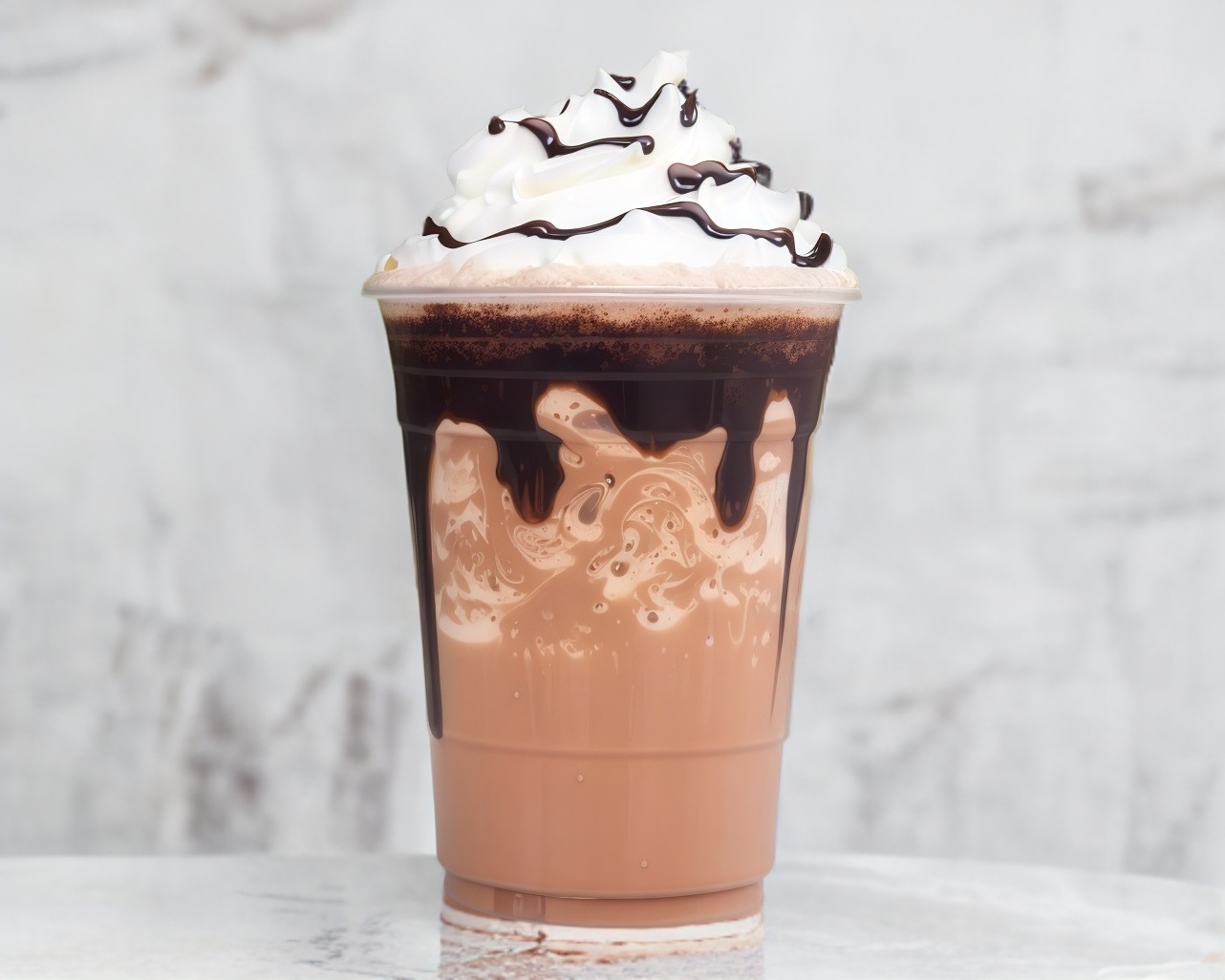 Rico Frappé sabor chocolate acompañado de crema pastelera, jarabe de chocolate y chispas Hershey's. ¡Pide ahora!