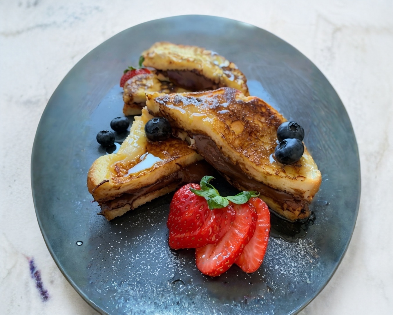 Delicio pan blanco al estilo tostada francesa con relleno de Nutella y almendras , bañado en miel de maple y porción de chispas de chocolate, una delicia para el paladar, ¡pide ahora! (imagende referencia, no incluye la fruta)
