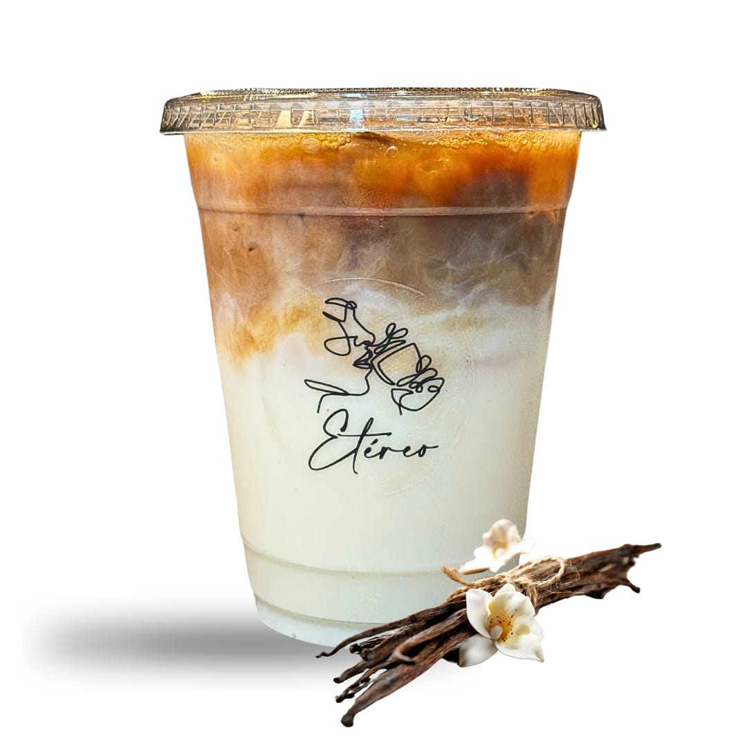 Nuestro cafe de especialidad en exptresso con la leche de tu eleccion en lasa rocas y un toque de sabor de jarabe de vainilla
