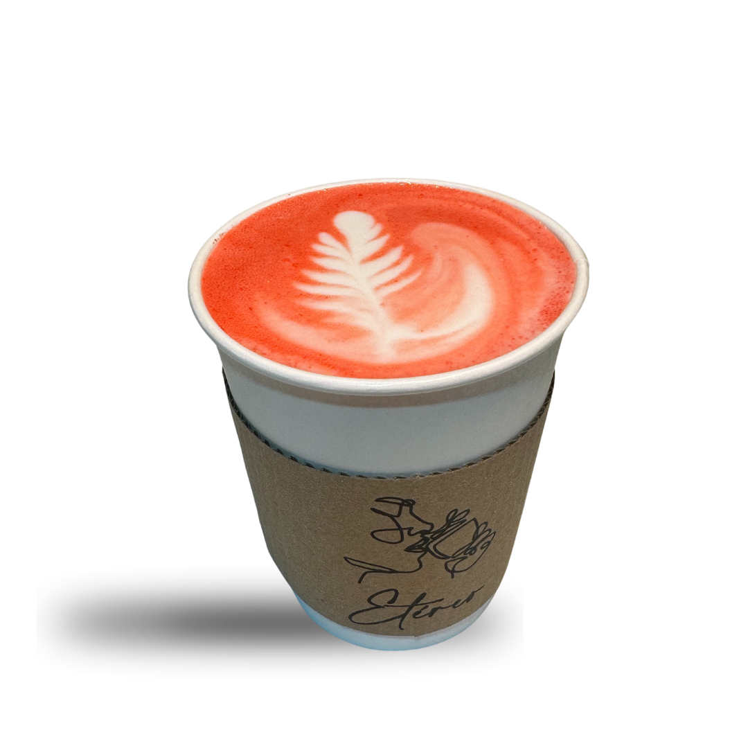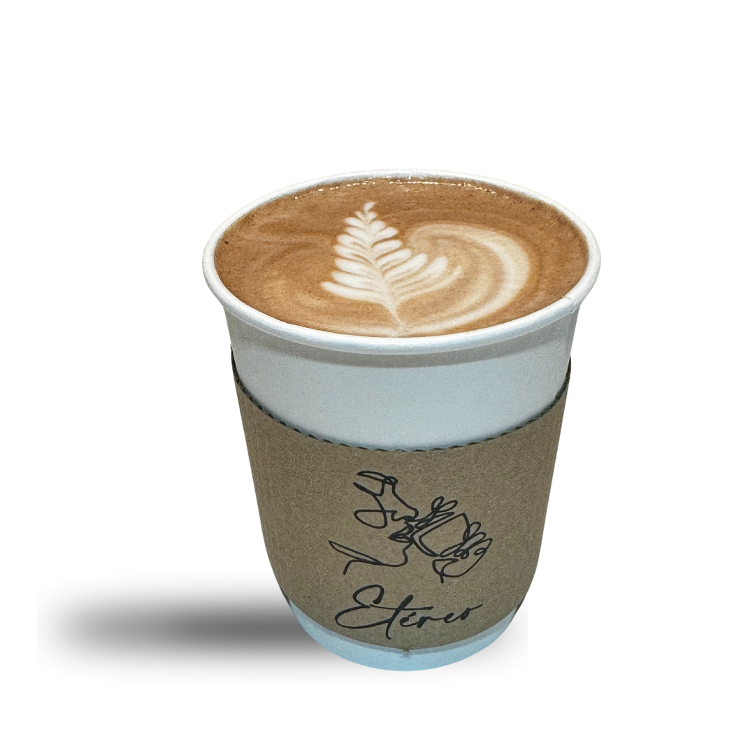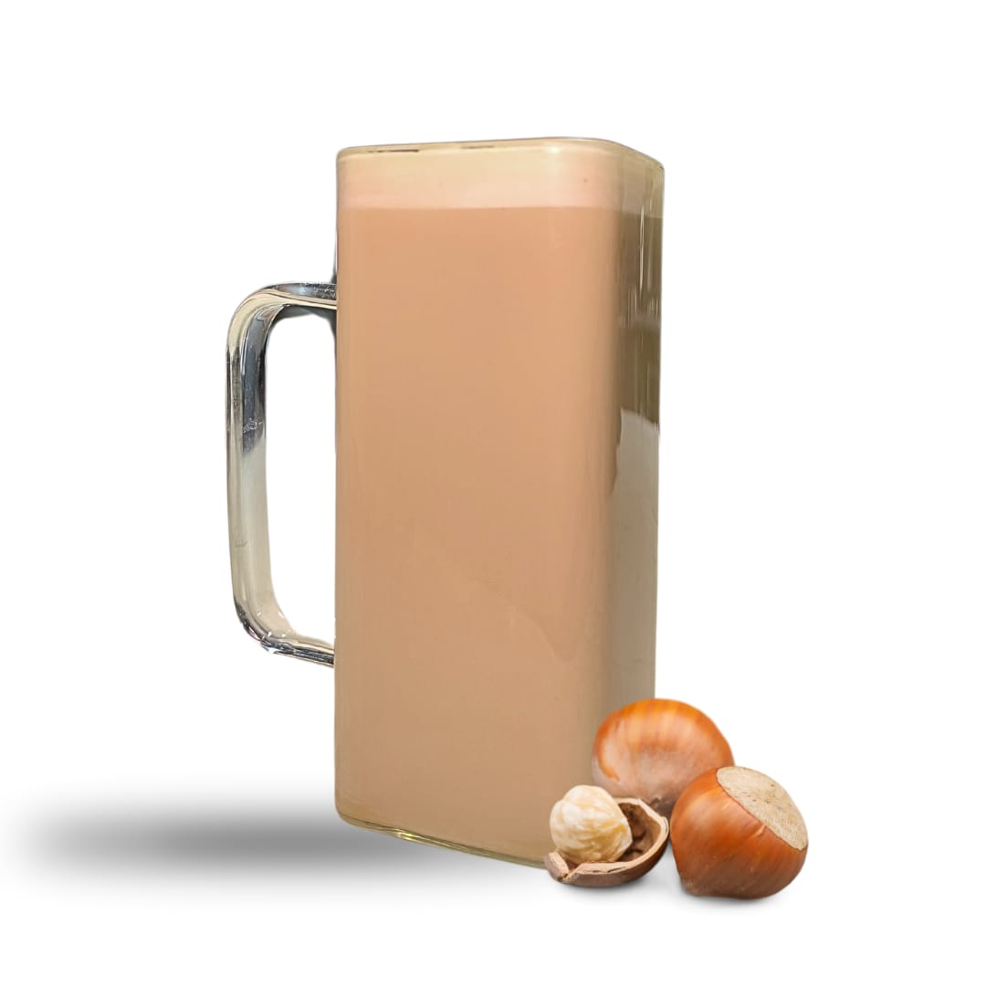 Nuestro cafe de especialidad en exptresso con la leche de tu eleccion calentada con bombilla y un toque de sabor de jarabe de avellana