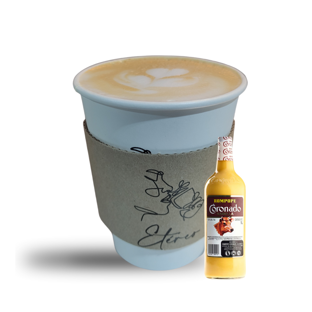 Nuestro cafe de especialidad en exptresso con la leche de tu eleccion calentada con bombilla y un toque de sabor de rompope