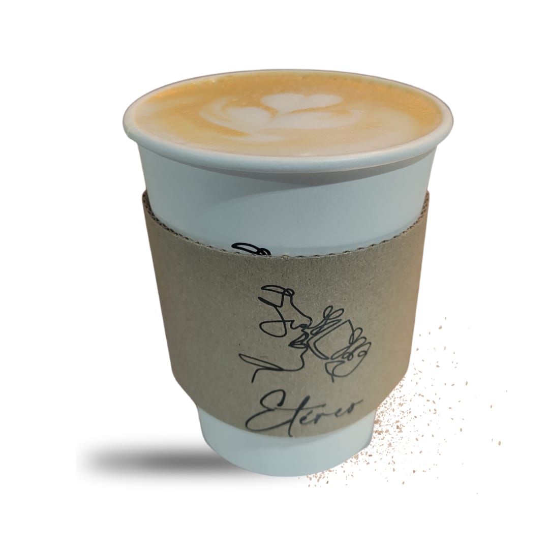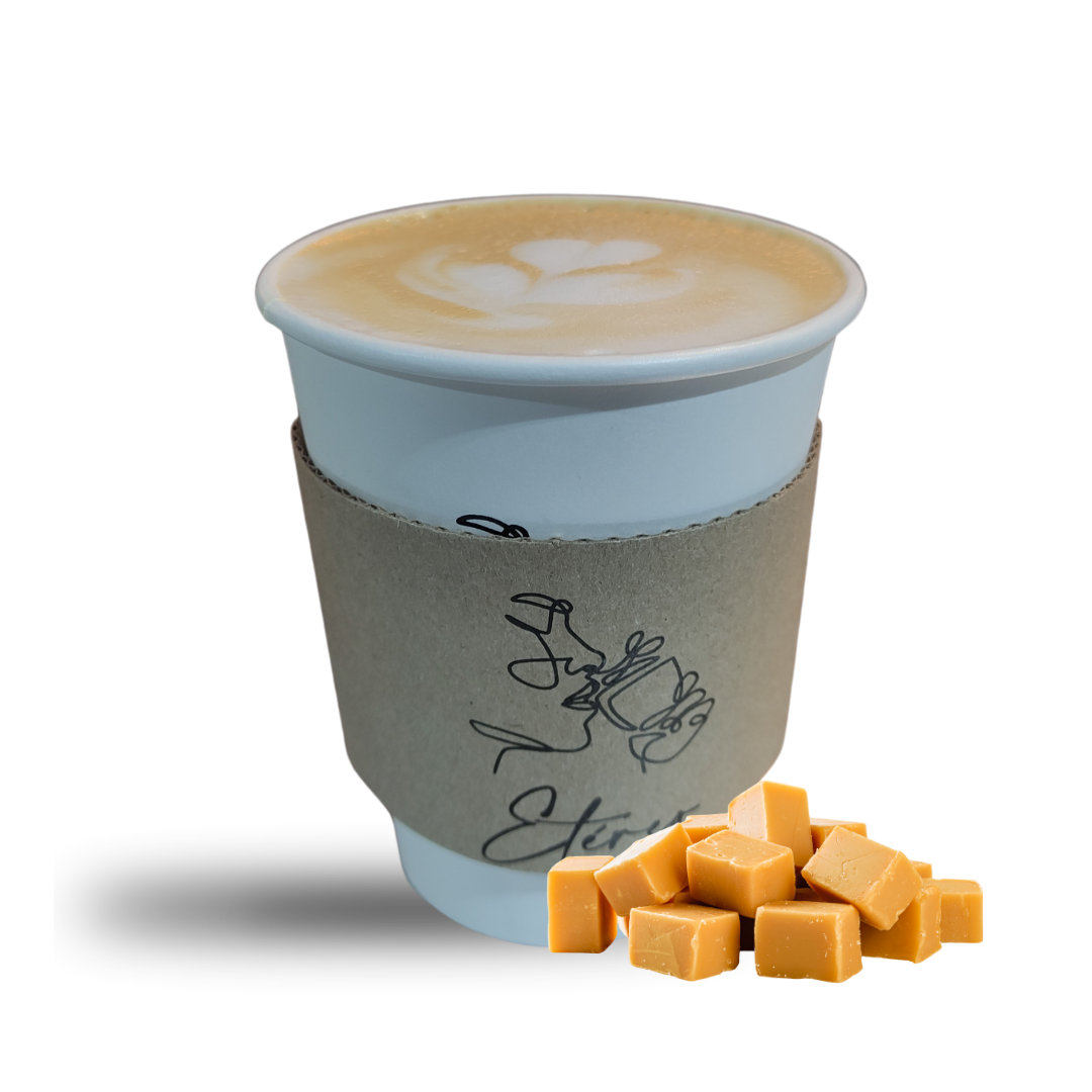 Nuestro cafe de especialidad en exptresso con la leche de tu eleccion calentada con bombilla y un toque de sabor de jarabe de caramelo