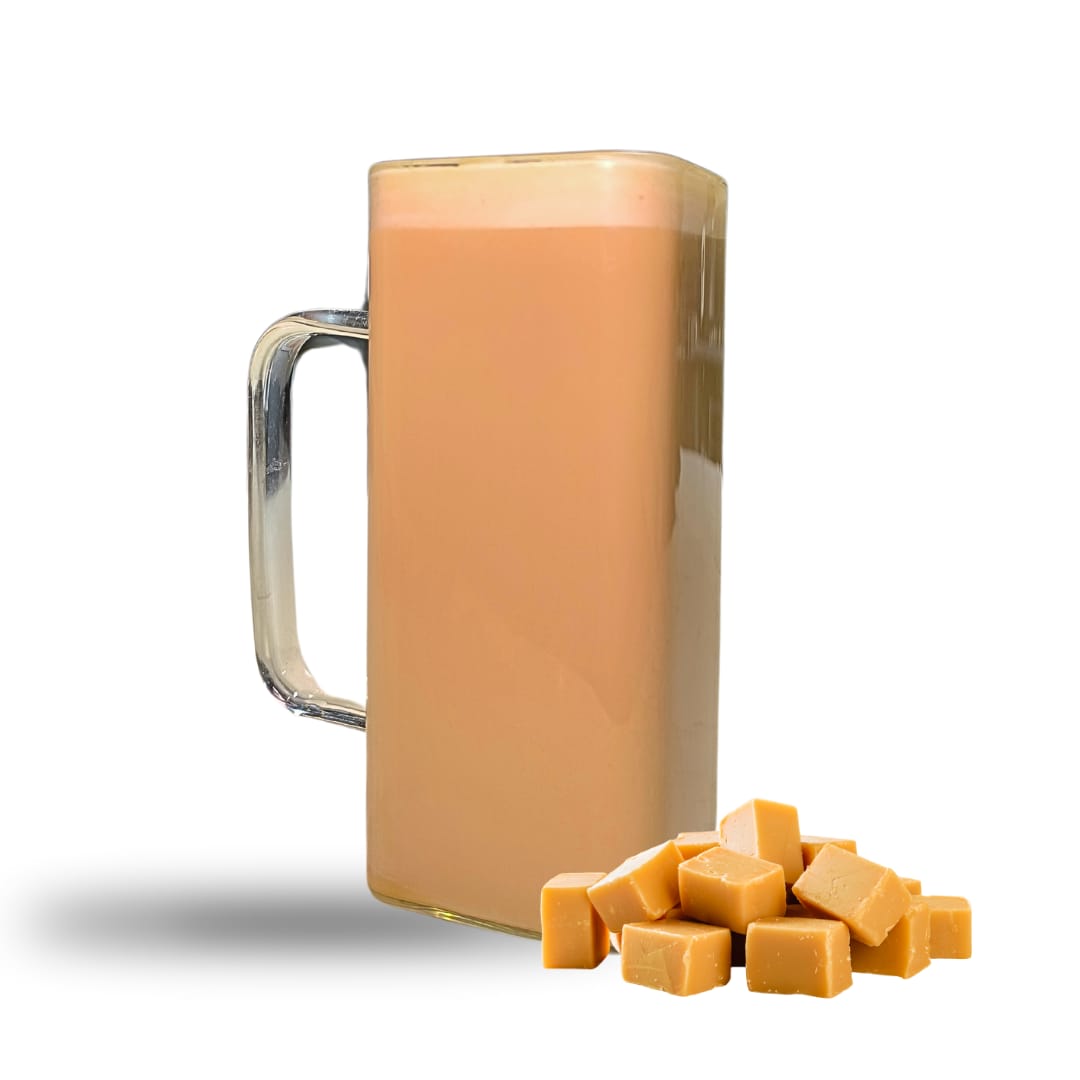 Nuestro cafe de especialidad en exptresso con la leche de tu eleccion en las rocas y un toque de sabor de jarabe de caramelo