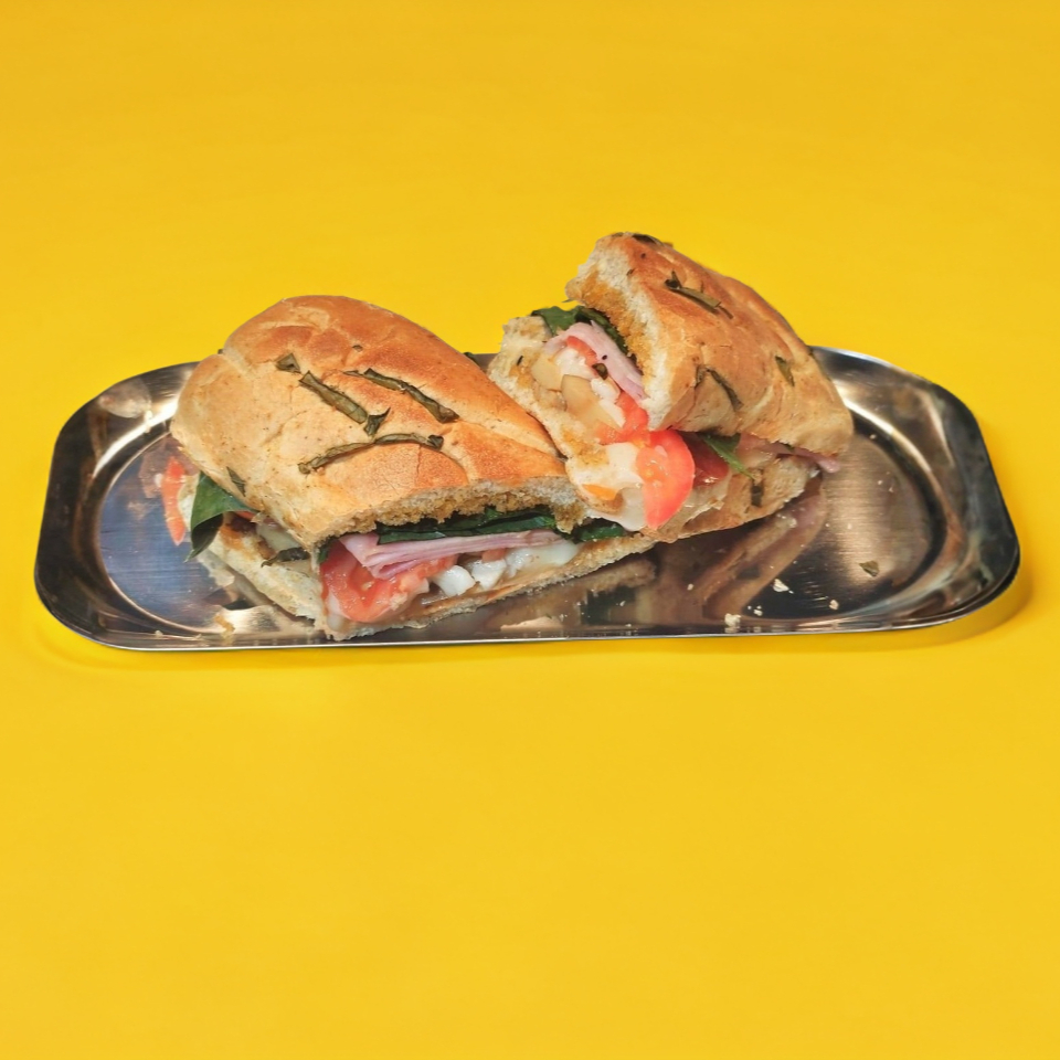 Pan paninni de alta calidad relleno con jamón de pavo, champiñones, queso mozzarella tomate, espinaca baby. Incluye chiles en vinagre.