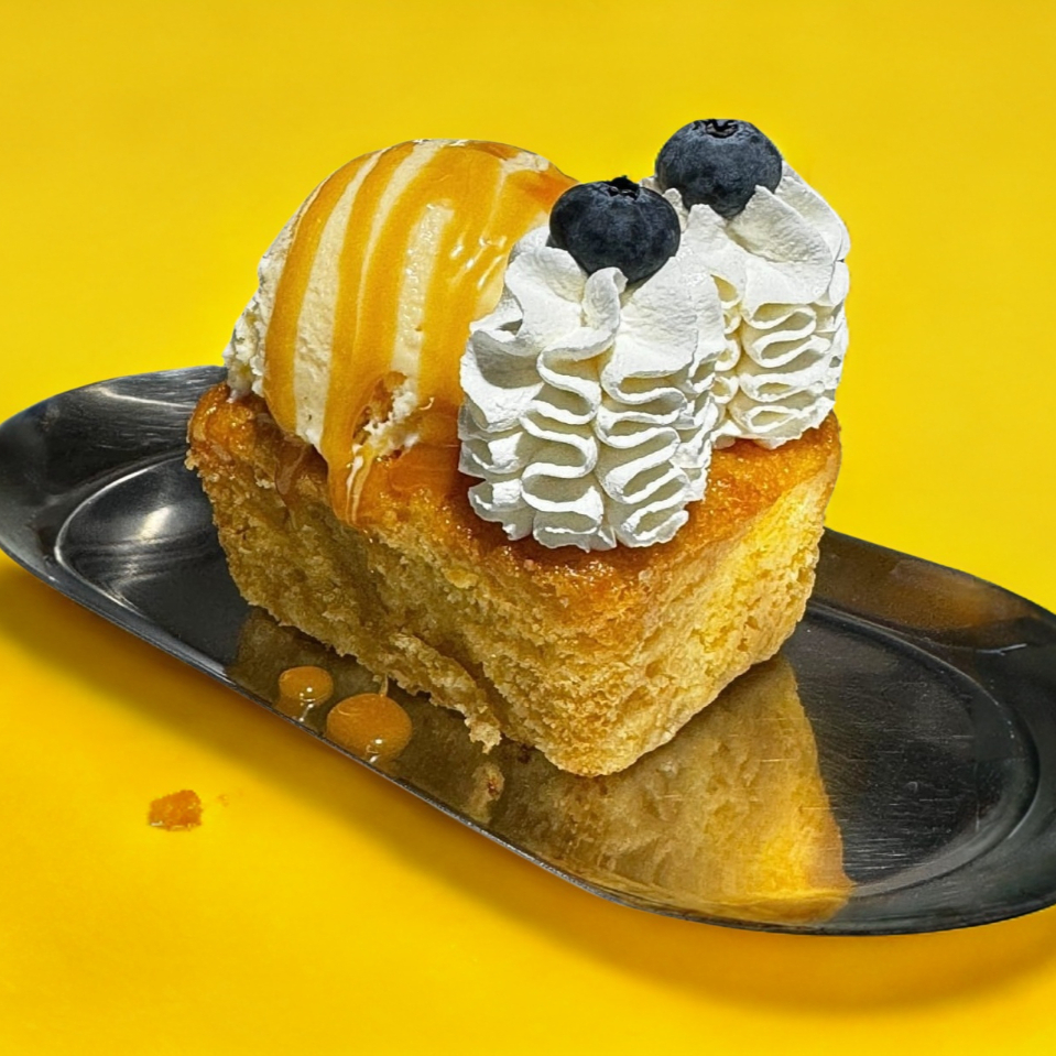 100% elote fresco (sin harina) acompañado de nieve de vainilla, crema batida y moras azules.