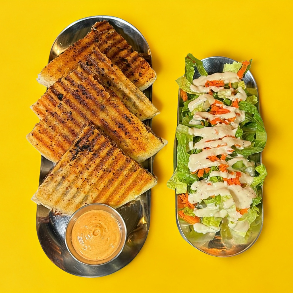 Pan pita tradicional , rellenos con carne de res y queso manchego. Ensalada a tu eleccioón y aderezo. Pan macerado con baharat, integrado por especias aromáticas: semillas de cilantro, pimentón, pimienta y cardamomo. Incluye un toque de chile piquín seco.