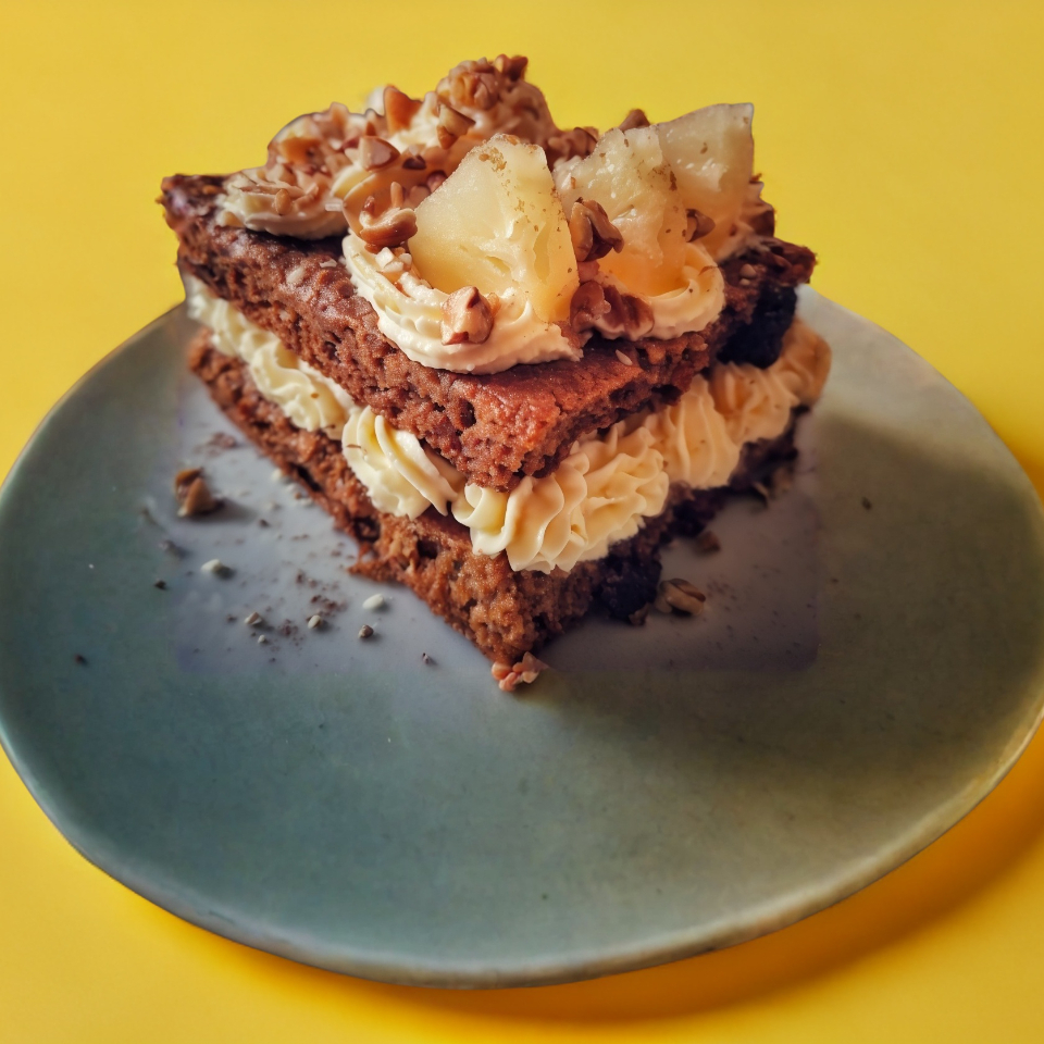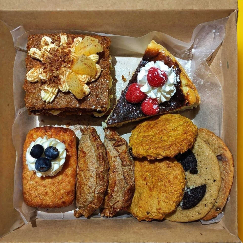 La caja contiene una rebanada de pastel de zanahoria y una de Cheesecake, un pan de elote, dos empanadas de cajeta, dos galletas de chispas de chocolate y dos galletas de avena