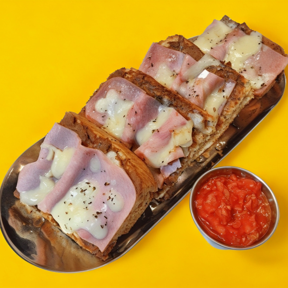 Delicioso paninni cortado por la mitad, tostado al horno y preparado con frijoles con chorizo, jamón y queso gouda. Acompañado con salsa exclusiva para este platillo hecha en casa