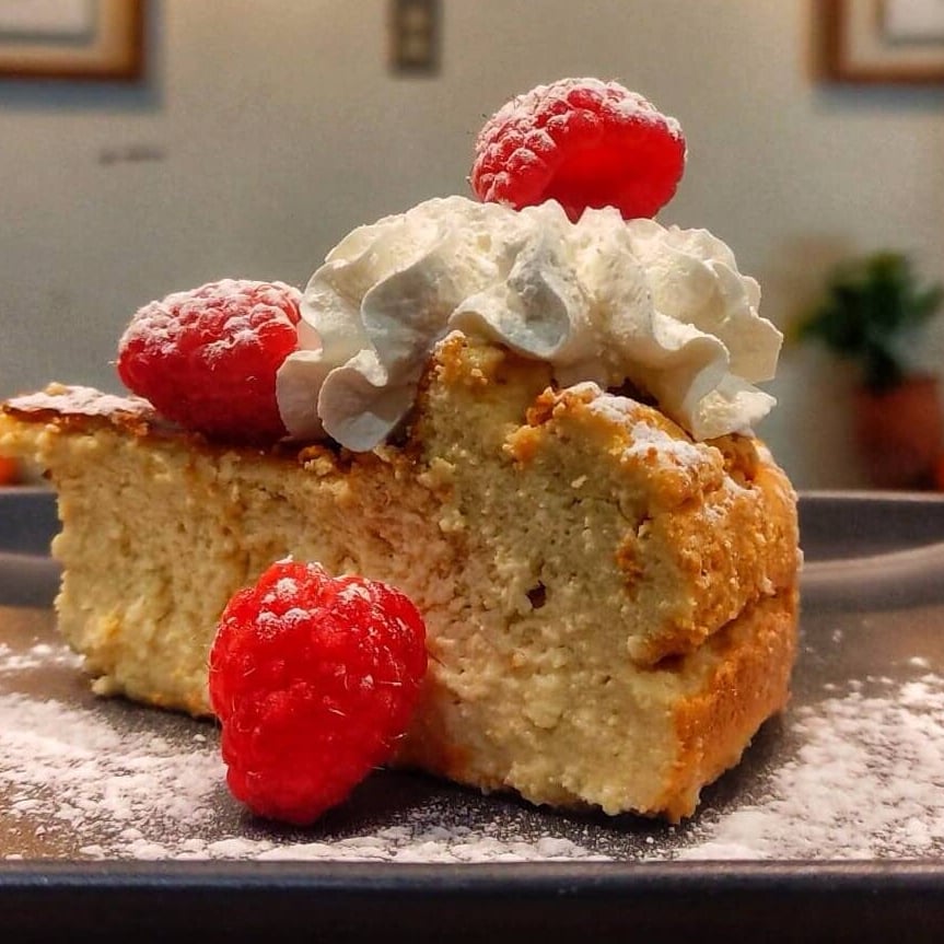Pastel de queso, acompañado de una porción de crema batida y fresas. Postre unico y exclusico de la casa