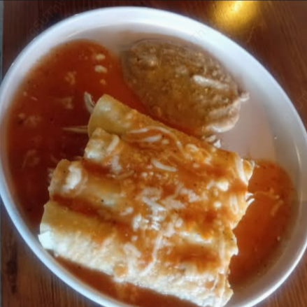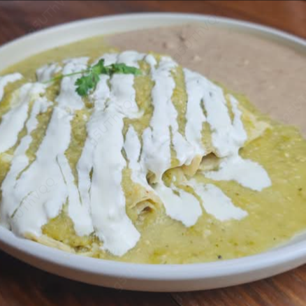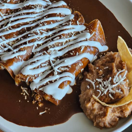 Envueltas con pollo, bañadas en salsa de mole, crema y queso, acompañados de frijoles refritos.