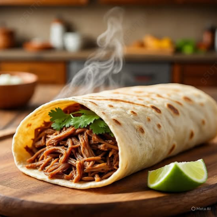 Tortilla de harina rellena de carne, frijoles, envuelto y listo para disfrutar.