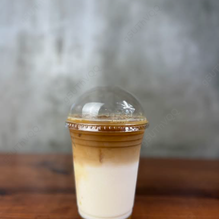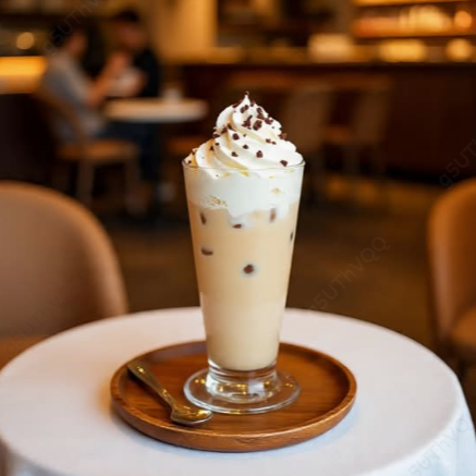Shot espresso licuado con hielo, jarabe de vainilla y leche.