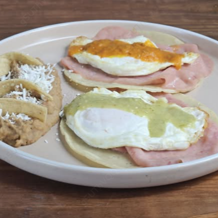 Huevos fritos sobre tortillas, bañados en salsa verde y roja, acompañado de frijoles.