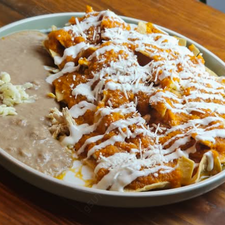 Tortillas troceadas y fritas, cubiertas con salsas y crema, acompañadas de frijol y proteína opcional.