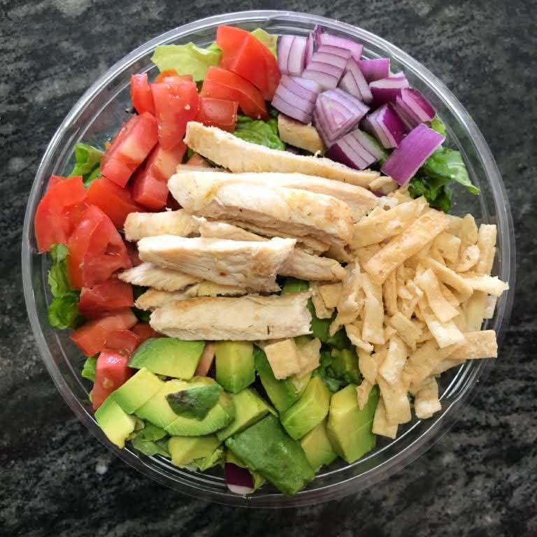 Base de lechuga Cebolla morada aguacate tomate tiras de tortilla pollo a la plancha Aderezo ranch Chiles vinagre