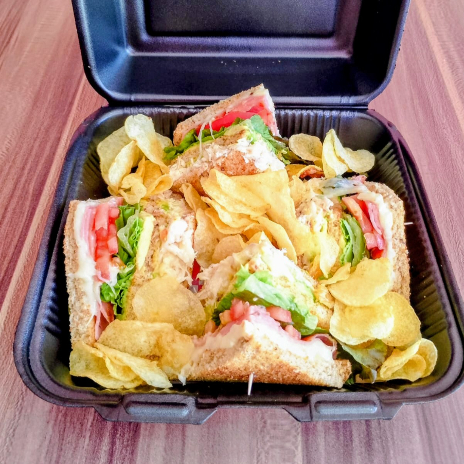 Sándwich con tres piezas de pan Pollo jamón queso aguacate tomate lechuga Sabritas salsa
