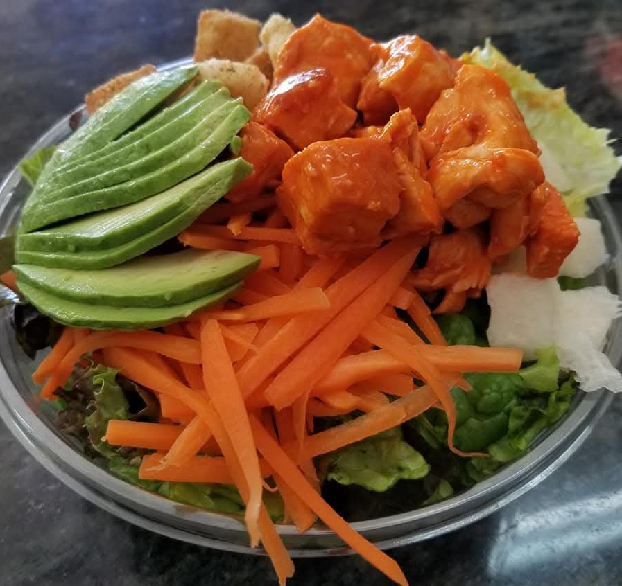 Base de lechuga Zanahoria Pepino Aguacate Crotones Aderezo ranch Pollo bañado en salsa búfalo