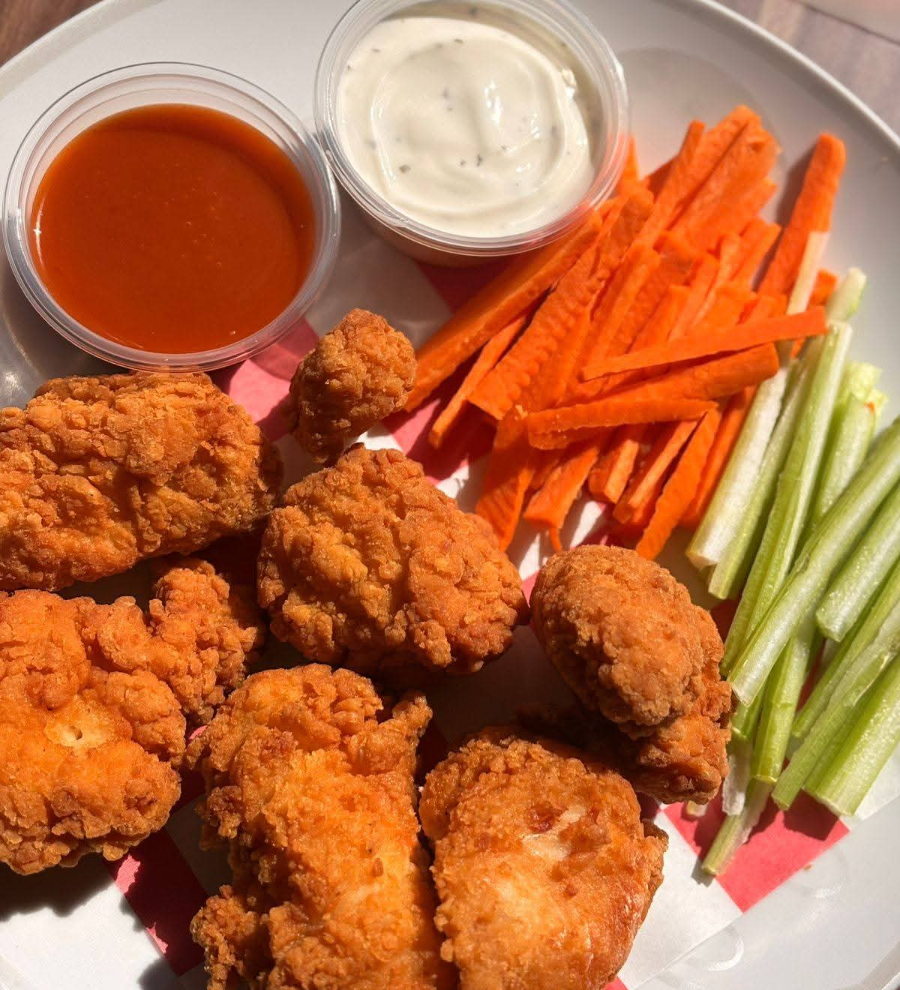 250 gm Zanahoria apio Aderezo ranch Y pueden escoger una salsa Búfalo, bbq ,mango habanero o pimienta limón