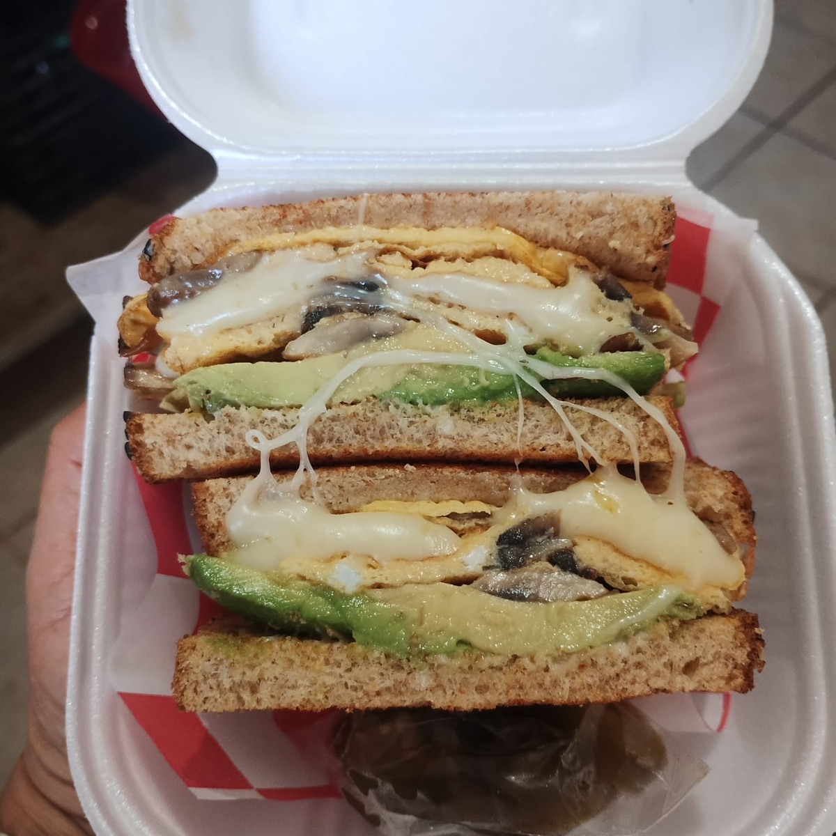 Pan integral con queso americano, aguacate, mayonesa y huevo.