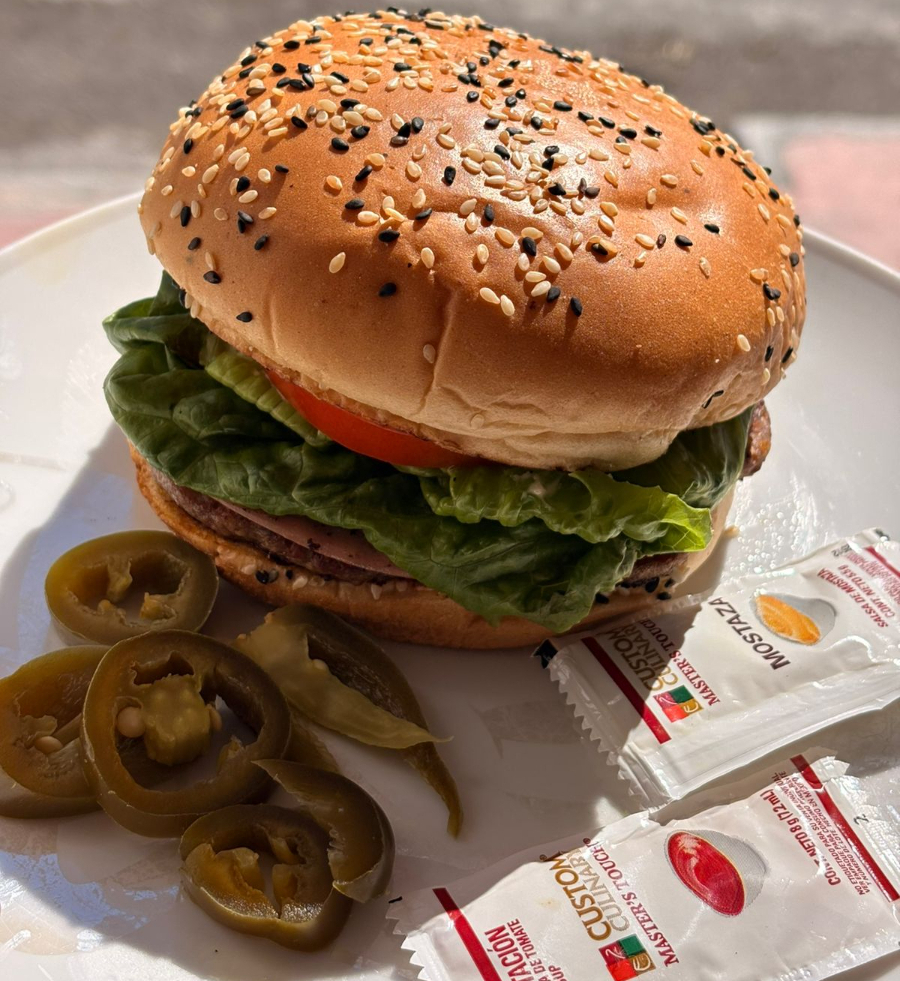 Carne de arrachera, queso americano, jamón, lechuga, aguacate, tomate y pan con ajonjolí
