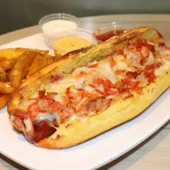 Pan tipo baguette en una cama de frijol negro, jamón de pavo y cerdo, tocino, queso manchego gratinado y trocitos de piña acompañado de salsa BBQ.